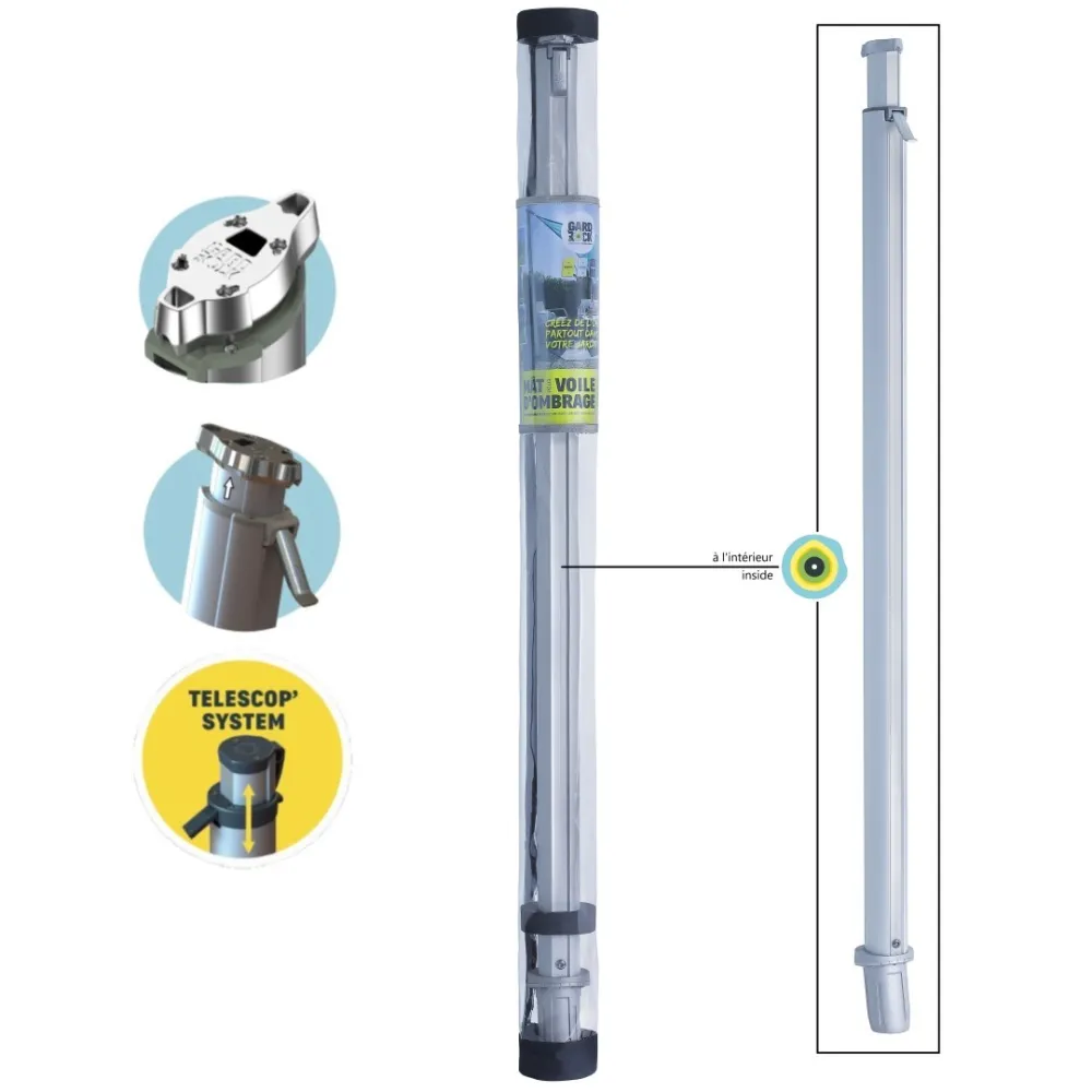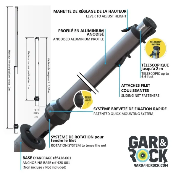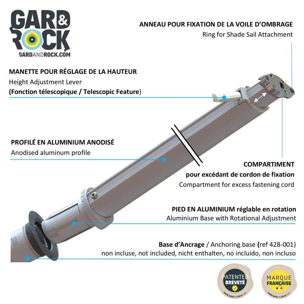 GARD&ROCK posts allow you to mount sunshades fast and easily anywhere in your garden (patio, lawn, veranda, poolside, etc). Our patented system offers repositionable anchoring to change your layout or free up your space in an instant. With its telescoping post, you can adjust its height whenever you want. Designed to be sturdy, you will enjoy a high-quality product designed in France. An essential accessory for spending happy times in optimal conditions.
