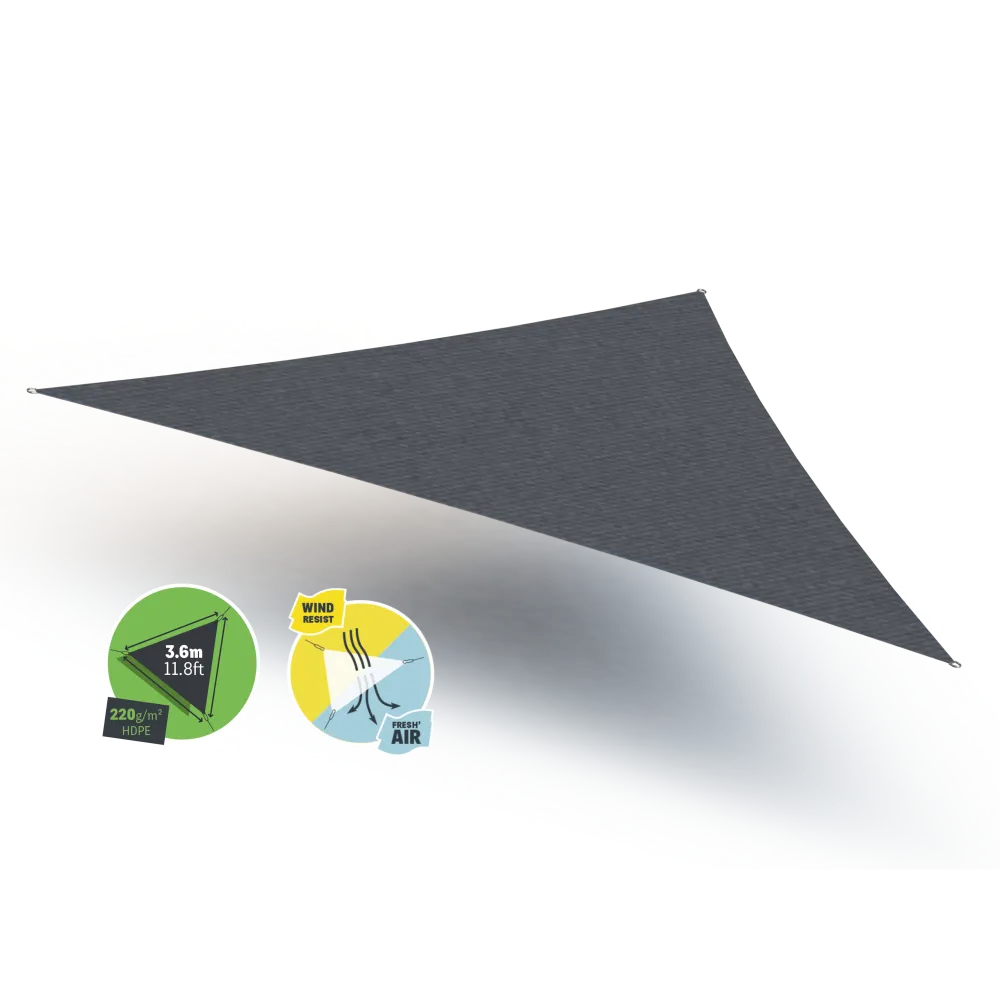 Choose an effective and stylish shading solution. Thanks to Gard&Rock's triangular shade sails, 3.6*3.6*3.6m (12*12*12 Ft), you can protect yourself from the sun while adding a decorative touch to your garden. Used with poles, you can create shaded areas anywhere in your outdoor space. Made from micro-perforated 220g/m2 HDPE, you will enjoy a high-quality product that comes in the colour of graphite.