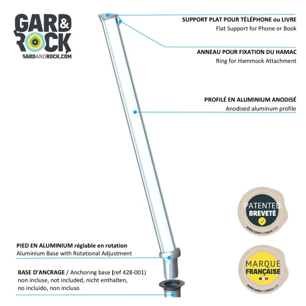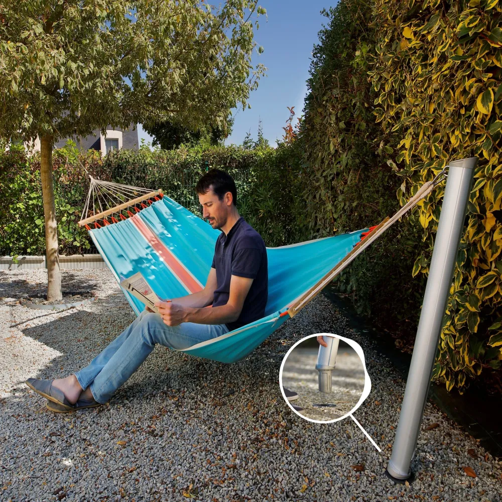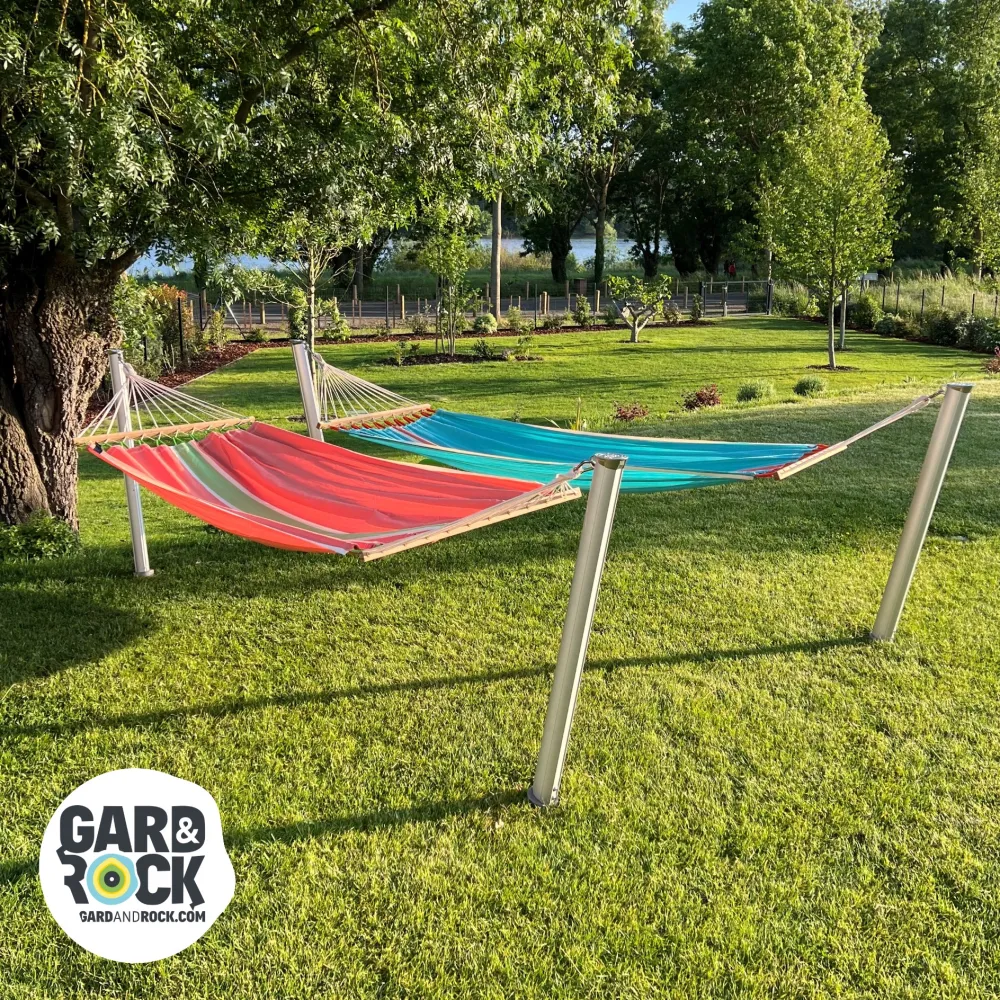 GARD&ROCK posts enable you to quickly and easily fix your hammock anywhere in your outdoor space (terrace, lawn, next to a swimming pool… ). Our patented system offers you removable anchoring enabling you to change the layout of your outdoor space or to clear it in an instant. Whether used with a tree or not, you maximise your chances of finding the ideal place to relax in complete tranquillity. Stylish and robust, this high-quality product was designed in France. An indispensable accessory for spending pleasant moments in your garden.