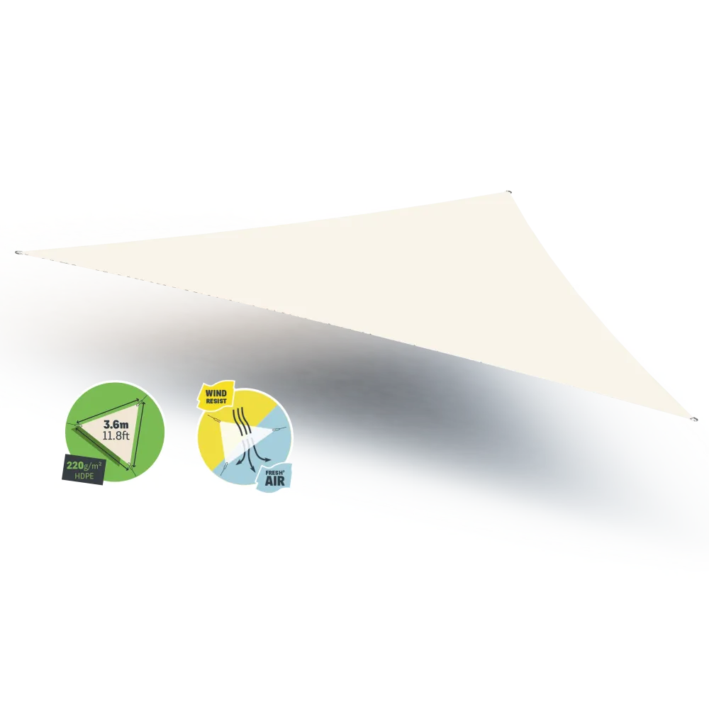 Choose an effective and stylish shading solution. Thanks to Gard&Rock's triangular shade sails, 3.6*3.6*3.6m (12*12*12 Ft), you can protect yourself from the sun while adding a decorative touch to your garden. Used with poles, you can create shaded areas anywhere in your outdoor space. Made from micro-perforated 220g/m2 HDPE, you will enjoy a high-quality product that comes in the colour of ivory.