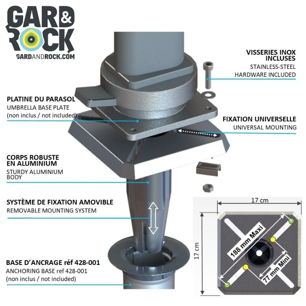 The Gard&Rock anchoring base enables sturdy and removable mounting of your outdoor equipment (parasols, gazebos, flags, bird boxes, sports equipment, etc.). Simply clip onto its anchoring base (sold separately) to adapt or free up your space in a flash and take full advantage of your garden!